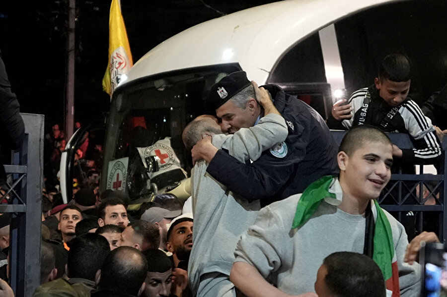Otobüslerden inen Filistinli esirler, soydaşlarının omuzlarında taşındı. Ramallah'ta belediyeye ait bir tesiste sağlık kontrolleri yapılan Filistinli esirlerin büyük çoğunluğunun zayıfladığı ve bazılarının da yürümekte zorlandığı dikkati çekti.