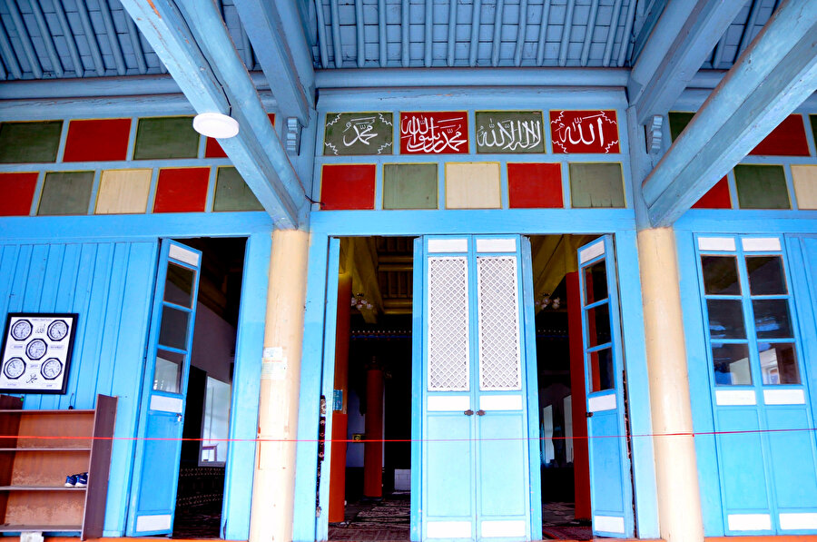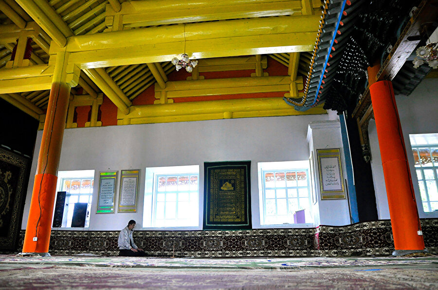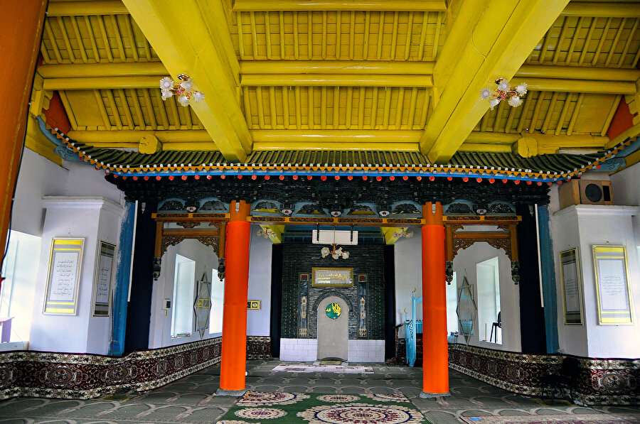 Çin mimarisiyle 1910'da inşa edilen ve rengarenk boyalara bürünen cami içerisinde, geleneksel Çin mitolojisinde yer alan ejderha, Anka kuşu ve aslan figürleri dikkati çekiyor.