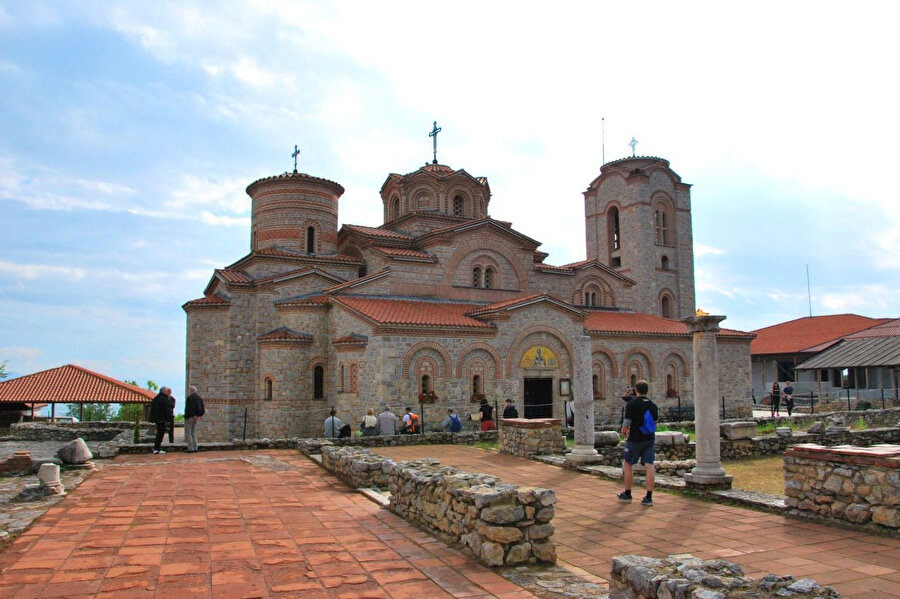 13. yüzyılda inşa edildiği değerlendirilen, erken Hristiyanlık dönemine ait özellikler taşıyan Kilise, arka planında bulunan Ohri Gölü'yle kartpostallık görüntü sunuyor.