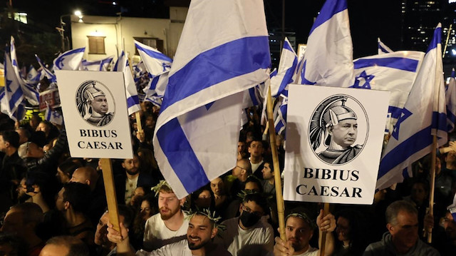 İsrail Başbakanı Benyamin Netanyahu'nun yargının yetkilerinin kısıtlandığı yasa teklifi ve politikalarına tepki gösteren on binlerce kişi, başkent Tel Aviv'de toplandı.
