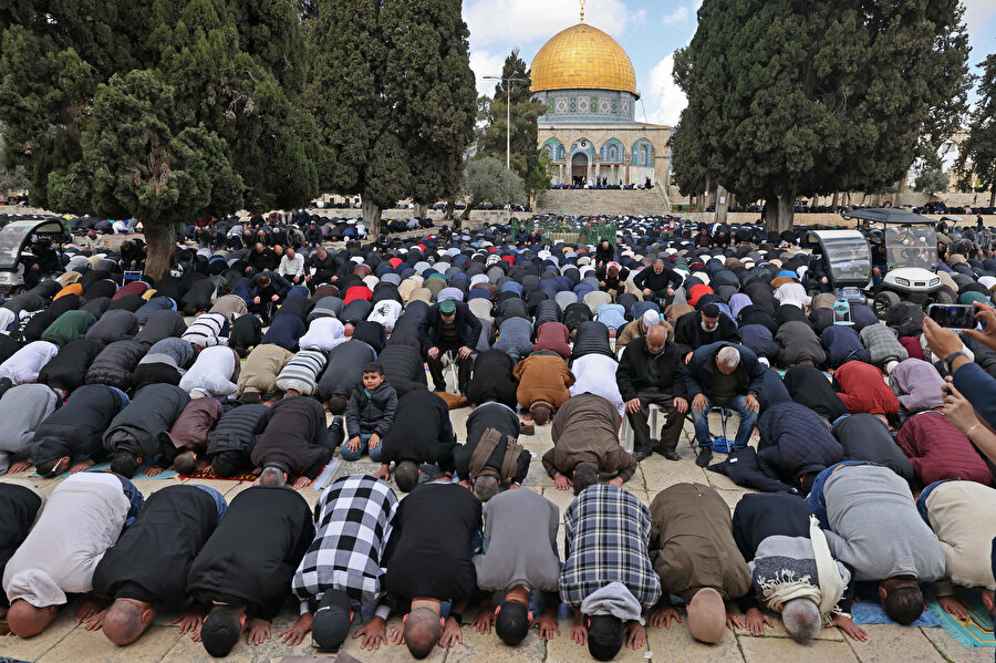 İsrail'in çıkardığı zorluklara ve engellemelere rağmen yaklaşık 80 bin Filistinli, Ramazan ayının ilk cuma namazını Müslümanların ilk kıblesi Mescid-i Aksâ'da kıldı.