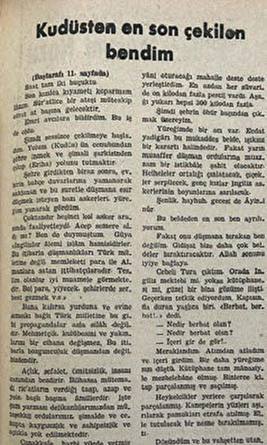 Yüreğimde bir acı var. Ecdat yadigârı bu mukaddes belde, ışıksız bir karartı halindedir. Fakat yarın muzaffer düşman ordularına muazzam bir istikbâle şahit olacaktır.