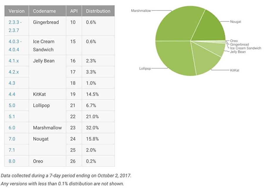 Android'in yeni sürümü Oreo'nun henüz bütün telefonlara ulaşmaması nedeniyle liste dışı kalacağı göz önünde bulundurulduğunda hangi Android sürümünün daha popüler olduğu konusunda gerçek bir istatistik ihtiyacı olduğu söylenebilir. Oreo'dan bir önceki sürüm olarak büyük beklentilerle karşımıza gelen Nougat'ın tüm olumlu yorumlara rağmen listede tepeden uzak kalması Oreo'nun geleceği hakkında da soru işaretleri oluşturmayı başardı. Android camiası içerisinde 2 Ekim'de edinilen verilere göre %32'lik oranla en fazla kullanılan Android sürümü Android 6.0 Marsmallow olmaya devam etti. Bu işletim sistemini %26,7’le Android 5.0 Lollipop takip ederken 3. sırada 17,8’le Android 7.0 Nougat bulunuyor.