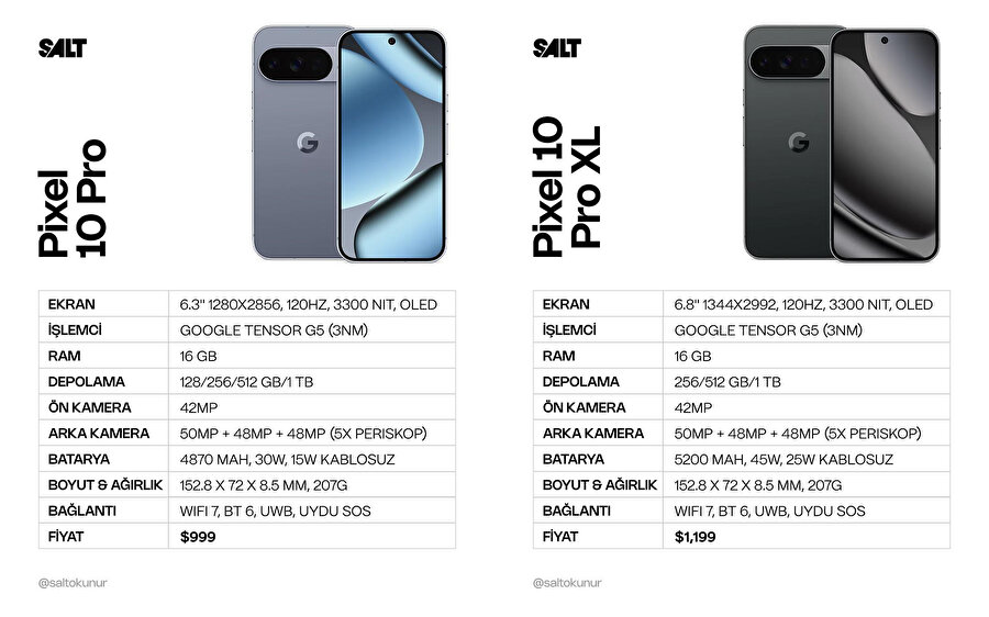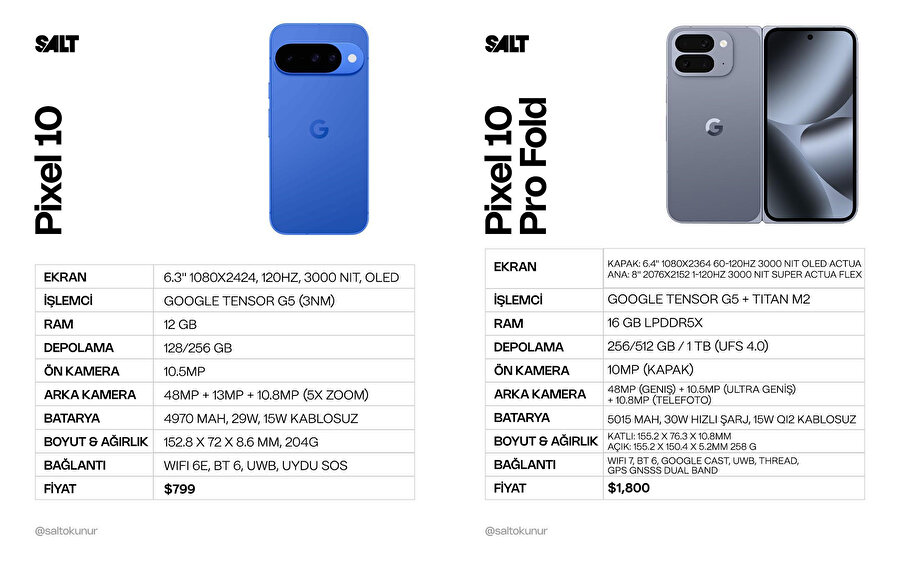 Pixel 10 Pro Fold, serinin en iddialı modeli olarak öne çıkıyor. 6.4 inç dış ekran ve 8 inç iç ekran ile birlikte geliyor. Yeni menteşe yapısı sayesinde cihaz 10 yıl boyunca katlanmaya dayanıklı olarak tasarlandı. IP68 sertifikasıyla suya ve toza karşı dayanıklı olan Pro Fold, güçlü batarya, UFS 4.0 depolama seçenekleri ve Tensor G5 işlemciyle kullanıcıların karşısına çıkıyor.