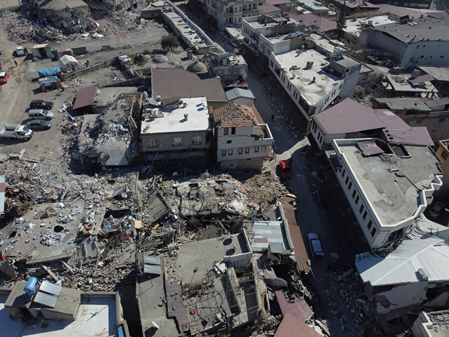 Havadan çekilen görüntülerde yapılardaki yıkım depremin etkisini gözler önüne seriyor.