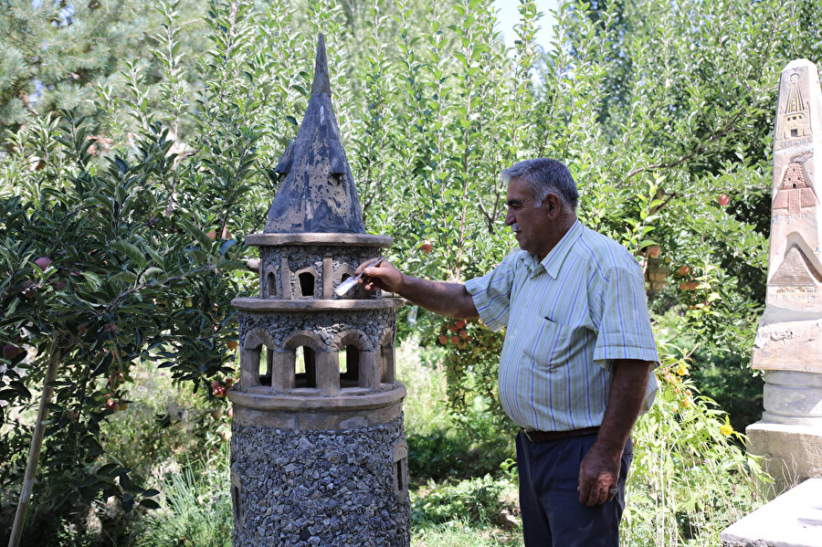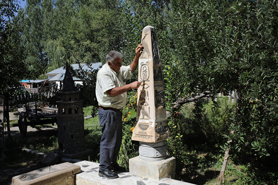 "Dikilitaş'ı yaptım. Taşın yüzeyinde çeşitli yazı ve kabartma resimler var. Urartu pullarıyla ilgili eserler yaptım. İstanbul’da bulunan Galata Kulesi'nin minyatürünü uzun süren çalışmayla tamamladım. Bunların yanında birçok ev aleti yaptım. Taşı oyarak el değirmeni yaptım. Yaptığım eserleri bahçemde sergiliyorum. Bahçemi müzeye dönüştürdüm. İnsanlar gelip fotoğraf çekiyor. Bu işi, eserlerimi gelecek nesillere aktarmak istiyorum."