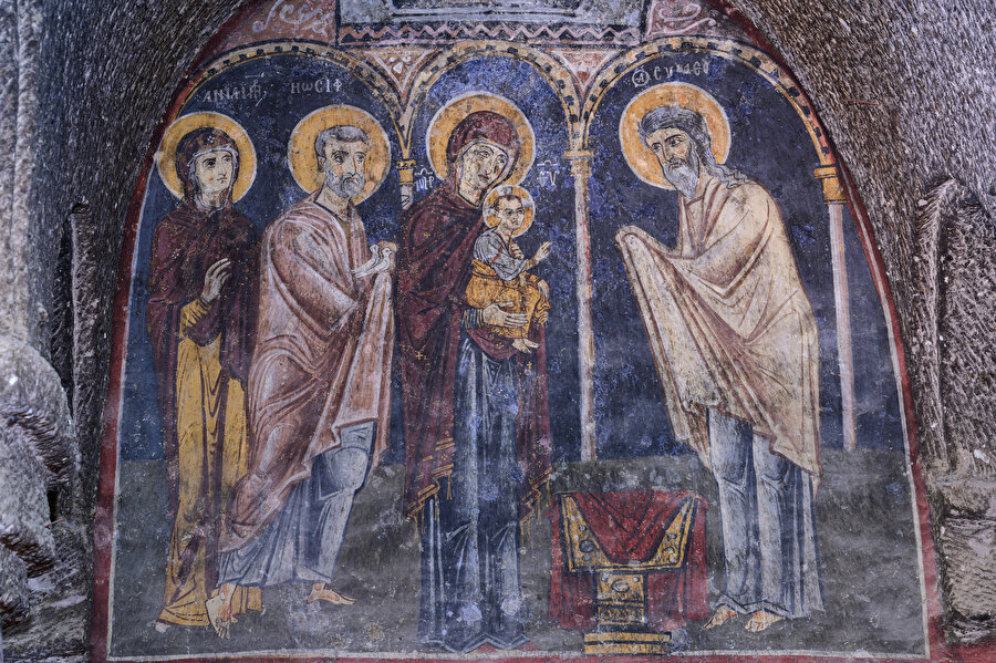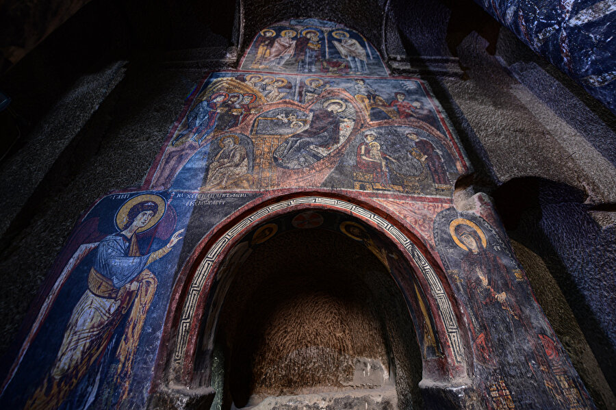 Hz. İsa'nın doğumunun müjdelenmesi, dadılarının Hz. İsa'yı yıkaması, Hz. İsa'ya hediye sunulması, Hz. Meryem'in Hz. İsa'yı azizlere tanıtması, baş melekler Gabriel ve Mikail'in Hz. Meryem'e tanrı selamını iletmesi de fresklerle anlatılıyor.