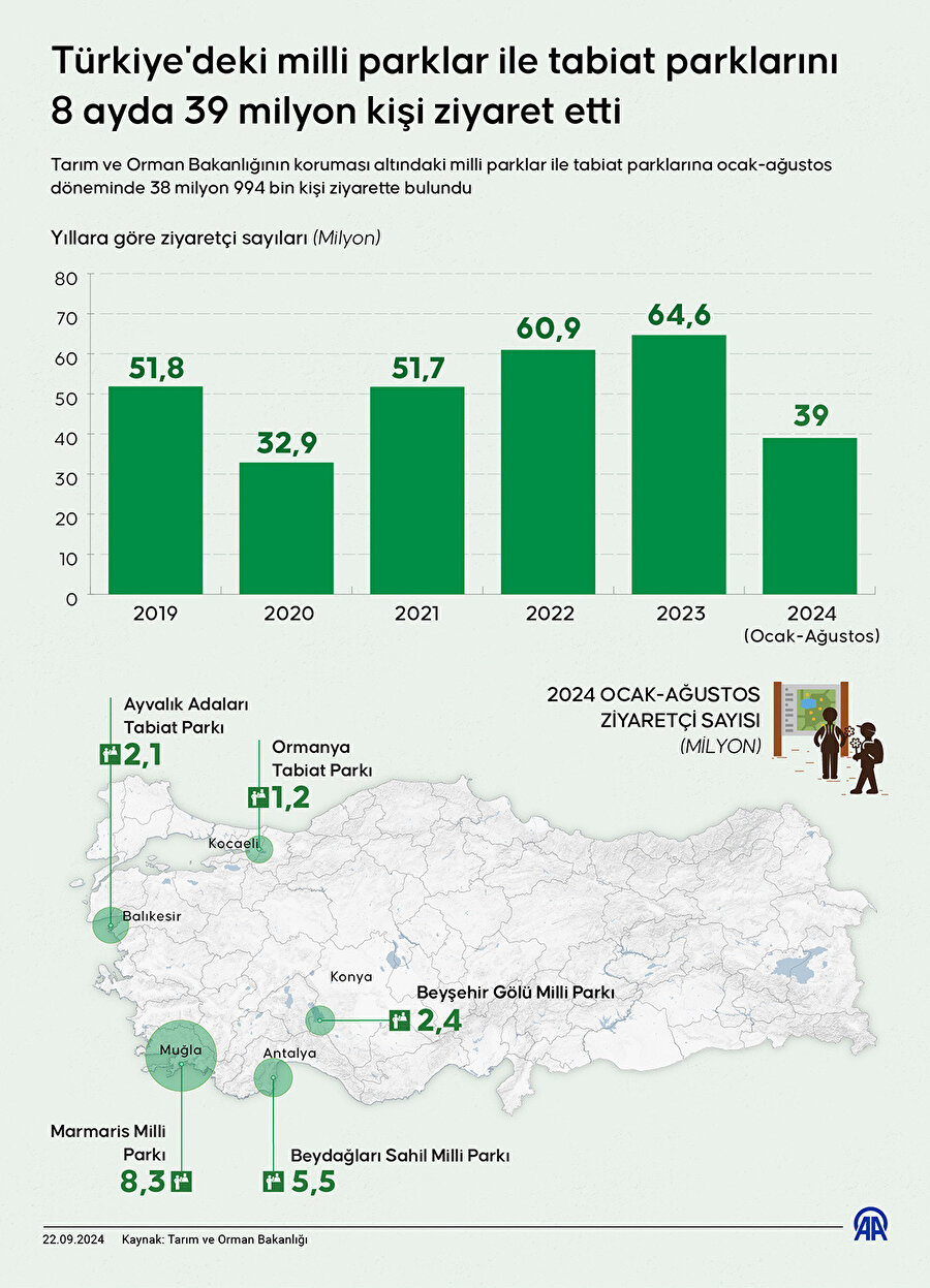 Bu alanları, 2019'de 51 milyon 832 bin, 2020'de Kovid-19 salgını tedbirleri kapsamında yaklaşık 2 ay kapalı olmasına rağmen 32 milyon 874 bin, 2021'de 51 milyon 756 bin, 2022'de 60 milyon 949 bin ve geçen yıl da 64 milyon 679 bin 581 kişi ziyaret etti. Bu yılın 8 aylık döneminde ise söz konusu yerlere gidenlerin sayısı 38 milyon 994 bin 280 kişiyi buldu.