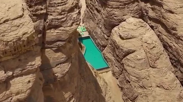 AW² Architecture & Interiors tarafından tasarlanan ikonik kaya havuzu, AlUla'nın çöl manzarasıyla bütünleşiyor. Kayalara oyulmuş bu özel mekân, doğa ve mimarlığın buluşmasını yansıtıyor.