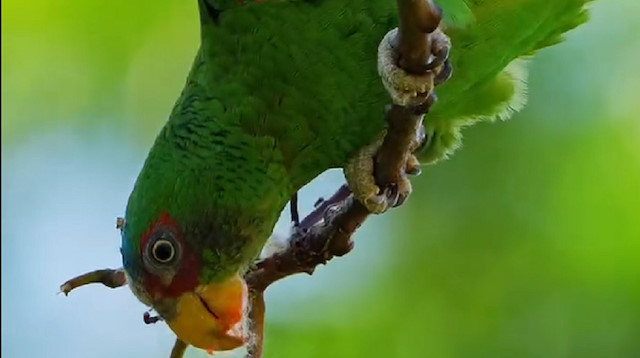 Bu güzel ağacın tepesinde, beslenmeye çalışan yeşil papağan..☺️