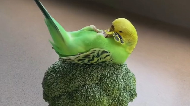 Brokoli üzerinde uzanan muhabbet kuşu, harika görünüyor. 😍🥦kuş