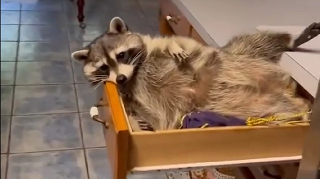 Çekmecede huzuru yerinde olan rakun. 🦝