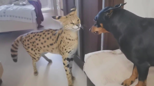 Sinirli bir köpek ve rahatını hic bozmayan Serval kedisinin, ilginç anları videoda.