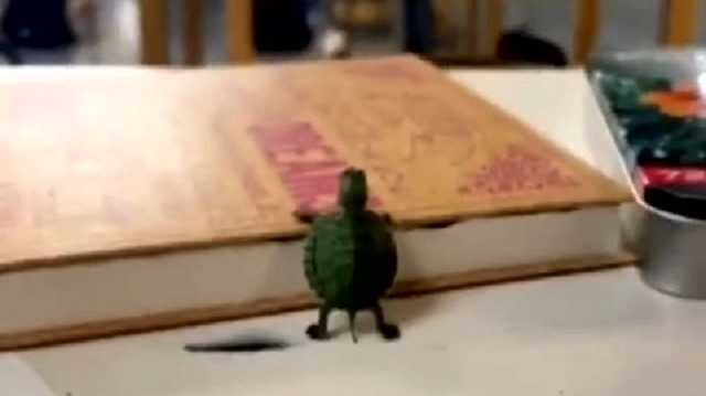 Sevimli kaplumbağanın, bir derslikte şirin anları kamerada.