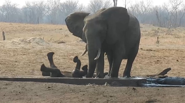 Çamurlu bir su oluğunda sırtüstü sıkışan yavru filin etrafını aslanlar çevirmiş. O an başka bir fil ailesi olay yerinden geçiyor ve fedakar bir anne gelip güçlükle de olsa yavru fili sıkıştığı yerden çıkarıyor. O anlar safari turistlerinin kamerasına böyle yansıyor.