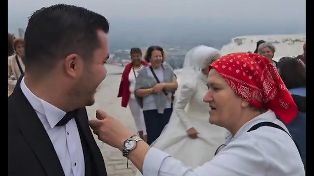 Pamukkale'de evliliklerinin birinci yıl dönümünü kutlamak isteyen bir çift, özel bir hatıra olması için profesyonel bir fotoğrafçıyla dış çekim yapmaya karar verdi. Ancak o anlarda yaşanan sürpriz gelişme, hem çifti hem de izleyenleri kahkahaya boğdu. Çekim sırasında orada bulunan yabancı turist kafilesi, çiftin yeni evlendiğini zannedince ortaya unutulmaz bir sahne çıktı.