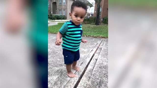 Bahçede yürüyüş yapan küçük çocuk, karşılaştığı kaldırım çizgisiyle nasıl başa çıkacağını düşünüyor.. ve üstünden atlamaya karar veriyor.