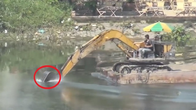 Eşine az rastlanır görüntülerde, platformun üstündeki kepçe operatörü kepçeyi bir kürek gibi kullanarak gölün diğer tarafına geçmeyi başarıyor...