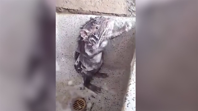 Lavaboda sabunla kendini temizleyen sıçan, sahibi tarafından böyle görüntülendi. Göbeğini, sırtını, kollarını güzelçe keseleyen evcil sıçan görenleri gülümsetti.