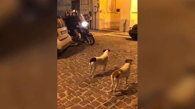 Sokaktaki iki köpek motosikletin hareket etmesini bekliyor. Adamların motordan inip yürüyerek köpekleri atlatmak istemesi fakat yine de saldırıya uğramaları kahkahalar eşliğinde kameralara böyle yansıyor.