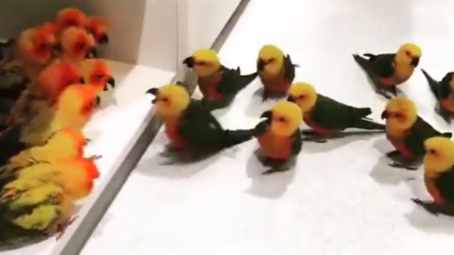 İki farklı türdeki yavru papağanların gövde gösterisi kameraya böyle yansımış.