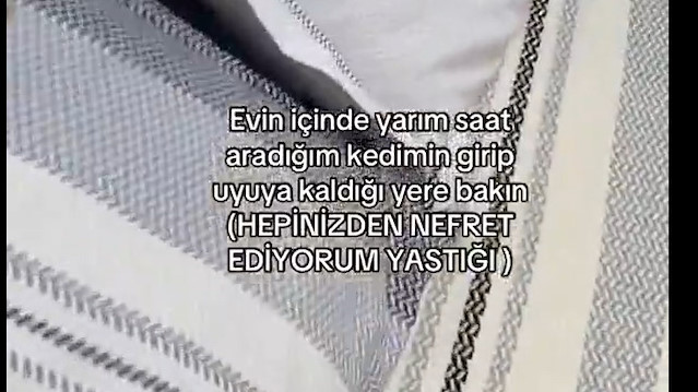 Sahibinin evin içinde onu yarım saat boyunca aramasına rağmen hiçbir yerde bulamadığı kedinin, yastığın içine girip mışıl mışıl uyuduğu anlar sosyal medyada hızla yayıldı. İlk bakışta kimsenin aklına gelmeyecek bu saklanma yeri, kedinin masum yüzünü ve yastığın arasından hafifçe görünen patilerini görünce izleyenlerin yüzüne bir tebessüm bıraktı. Sahibi ise şaşkınlıkla karışık bir rahatlama yaşayarak videoya esprili bir not düştü: “Hepinizden nefret ediyorum yastığı.” Bu ifadeyle yaşadığı şoku tatlı bir mizaha dönüştüren kullanıcı, kedilerin ne kadar sürprizlerle dolu olduğunu da yeniden hatırlattı.