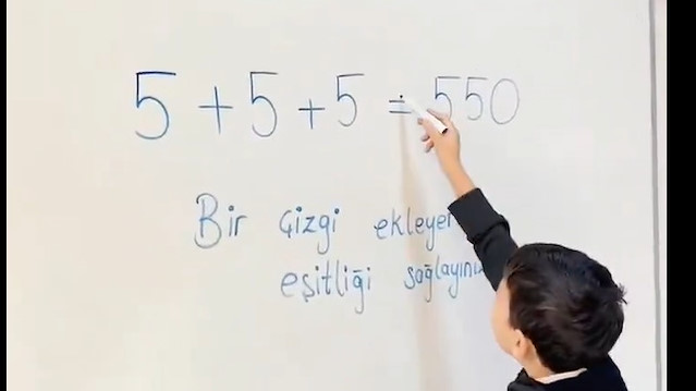 Bir öğretmen, tahtaya “5 + 5 + 5 = 550” yazıp öğrencilerinden yalnızca bir çizgi ekleyerek eşitliği sağlamalarını istedi. İlk bakışta basit görünen bu soru, sınıfta adeta bir beyin fırtınası yarattı. Her öğrenci kendi çözümünü ararken, tahtadaki rakamlar ve semboller arasında yaratıcılığın kapıları aralandı.