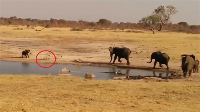 Göl çevresinde pusu kuran timsahları korkutan yavru fil safari kameralarına böle yansıdı.