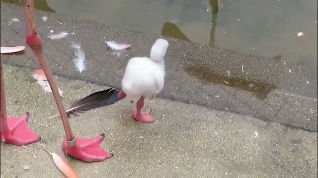 Yavru flamingo tek ayak üzerinde durmayı öğreniyor.
