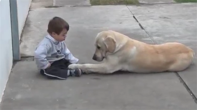 Down sendromlu küçük bir çocuk ile Labrador Retriever cinsi bir köpek arasındaki tatlı oyun, izleyenleri derinden etkiledi.