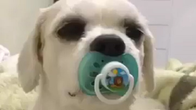 Bu tatlı köpek emzik emiyor.