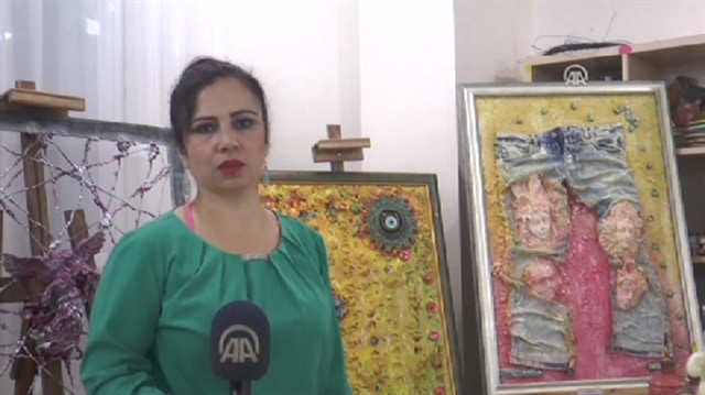 Adana'da bir tekstil firmasında çalışan Meysun Mirel'in, inşaat malzemeleri ve atık kumaşlardan yaptığı tablolar beğeni topluyor.