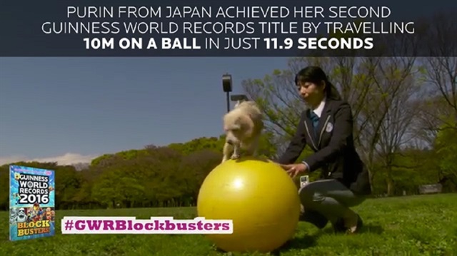Purin isimli Beagle cinsi köpek zeka ve yetenek dolu videolarının yanı sıra bir de Guinness Rekorlar Kitabı'na girdi. Top üzerinde 10 metreyi en hızlı giden köpek unvanını 11.9 saniyeyle aldı.