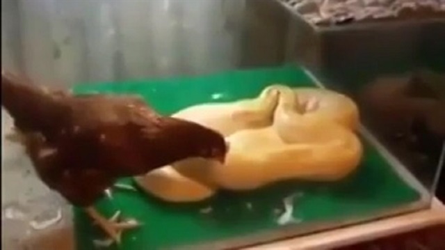 Sarı piton kocaman tavuğu bir anda yuttu.