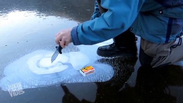Rune Pettersen isimli Norveçli adam, gölü kibritiyle yakıp birde üzerinde çay demliyor.