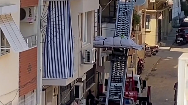 Denizli'de tüp mide ameliyatı sonrası hastaneden taburcu olan ve Aydın'da geçirdiği kalp krizi sonucu hayatını kaybeden 310 kilogram ağırlığındaki Barış Yıldırım'ın cenazesi, evinin penceresinden eşya taşıma asansörüyle çıkarıldı.