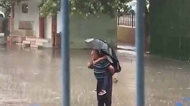 Adana'da yürekleri ısıtan bir görüntü sosyal medyada büyük ilgi gördü. Şiddetli yağmurun altında okul bahçesinden yükselen İstiklal Marşı'nı duyan yaşlı bir adam, torununu sırtına alarak saygı duruşuna geçti. O anlarda yağmura aldırış etmeden marşı sonuna kadar coşkuyla okudu.