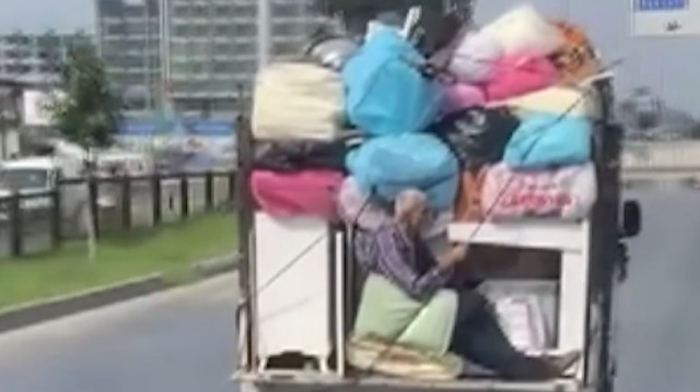Adana'da iki ayrı kamyonette yoluculuk yapan vatandaşlardan biri kendini iple kamyonete bağlarken, diğeri de kamyonet kasasındaki hamakta keyifle yoluculuk yaptı. Şehir merkezinde kamyonette iki vatandaştan renkli bir o kadar da tehlikeli yolculuk yaptığı anlar ortaya çıktı. Bir vatandaşın ev eşyası taşınan kamyonetin kasasına bindiği görüldü. Vatandaşın düşmemek için kendince önlem alıp eşyaların bağladığı iple kendini de bağlaması dikkat çekti. Bu ilginç ve bir o kadar da tehlikeli anlar ise bir başka araçtaki vatandaş tarafından cep telefonu ile görüntülendi. Vatandaşlar o anlara 'Güvenli yolculuk' ismini verdi. 'Kamyonet kasasında hamak' Adana'da bir başka kamyonet kasasına ise hamak yapıldığı görüldü. Kentin en işlek caddesinde seyir eden bir kamyonetin kasında yapılan hamağa uzanan bir kişinin keyifle yolculuk yaptığı anlar saniye saniye görüntülendi. Hamakta uzanan vatandaş hızla giden kamyonetin kasasında tüm tehlikeye rağmen yolculuk yapmaya devam etti.