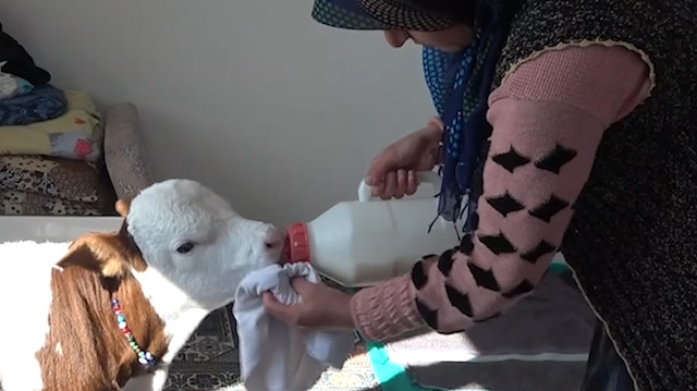 Adıyaman'ın Şerefli Köyü'nde 35 yıldır hayvancılıkla uğraşan 3 çocuk annesi Birgül Coşkun ve Mehmet Coşkun'un ahırda besledikleri ineği erken doğum yaptı. 8 ay 10 günlük olarak doğum yapan ineğin buzağısı halsiz ve bitkin bir şekilde hayata gözlerini açtı. Ölmek üzere olan buzağının annesini emmediğini ve ineğin de oldukça üzüldüğünü fark eden Coşkun Çifti, buzağıyı yaşadıkları eve çıkararak odada beslemeye başladı. Hasta beziyle buzağının altını bağlayan, biberonla karnını doyurmaya çalışan Coşkun Çifti, buzağıyla aynı odada yaşam sürmeye başladı. Buzağıyla 11 gündür ayı odada yaşayan Coşkun ailesi, buzağıya gözleri gibi bakıyor. Sobalı odada ayaklanan ve sağlık durumu her geçen gün daha da iyiye giden buzağı, 3 çocuklu Coşkun ailesinin adeta bir ferdi oldu. Buzağıya çocukları gibi baktıklarını dile getiren Mehmet Coşkun, “İneğin doğumuna 20 gün kala doğum gerçekleşti. Doğum sonrası buzağının durumu iyi değildi. Bizlerde bu nedenle buzağıyı alarak eve getirdik ve odamızda sobanın yanında beslemeye başladık. Birkaç gün sonra buzağı canlanmaya başladı. Önce şırıngayla besledik daha sonra ise biberonla beslemeye başladık. Ayaklandı ve oldukça hareketlendi. 11 gündür aynı odada yaşıyoruz kendisine de çok alıştık. Ailemizin bir ferdi oldu, çocuk gibi bakıyoruz ona” dedi. Birgül Coşkun ise konuşmasında, “Bir çocuğa nasıl bakılıyorsa bende aynen öyle bakıyorum. Gece uyanıp biberon istiyor ve kendisine süt veriyorum. Bezini değiştiriyorum. Biraz oynayıp zıpladıktan sonra yeniden yatırıp uyumasını sağlıyorum. Kendisine çok alıştık ve yeniden ahıra götürmeyi düşünmüyorum” diye konuştu.