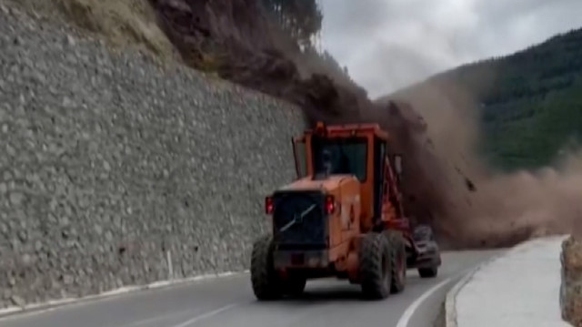 Artvin'de etkili olan yağmur ve kar yağışı sonrası meydana gelen heyelanda, yol temizleme çalışması yapan iş makinesi son anda kurtuldu. O anlar cep telefonu kamerasına yansıdı.