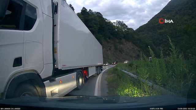 Artvin-Hopa karayolunda hatalı sollama yapan bir tır, kazaya ramak kala durabildi. Karşı yönden gelen otomobil, tırın altında kalmaktan son anda kurtuldu. O anlar saniye saniye araç kamerasına yansıdı.