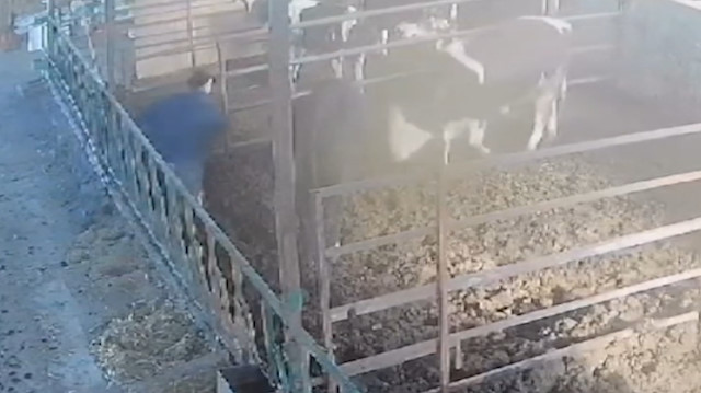 Aydın'ın Söke ilçesinde ahırı temizleyen kişiye dananın saldırdığı anlar güvenlik kamerasınca kaydedildi.