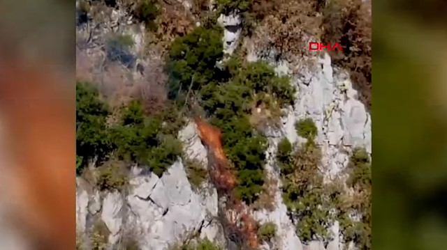 Geçen pazar günü Küre Dağları Milli Parkı'nda çıkan orman yangını, 3 helikopter ve kara ekiplerinin müdahalesiyle 6 saatte söndürüldü. Yangının ardından bölgede sarp kayalık arazide soğutma çalışmaları sürdürüldü. Dün akşam saatlerinde, Bartın Orman İşletme Müdürlüğü'ne bağlı işçiler, soğutma çalışması yaparken tehlike atlattı. Kayalık alanda çalışma yapan 3 işçi, rüzgarla bir anda büyüyen alevlerin arasında kalmaktan son anda kurtuldu. İşçilerin panik anları ve kayalıklardan tırmanarak uzaklaşmaları, Orman İşletme Müdürlüğü'nün dron kamerasına yansıdı.