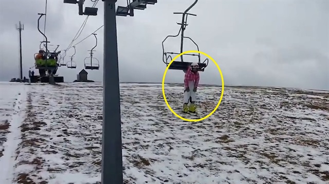 Kayak takımıyla ski lift'e binen küçük çocuk bir takım aksilikler yaşamış olacak ki oturak kısmında asılı kalmış. O anlar başka turistler tarafından böyle kayda alınmış.