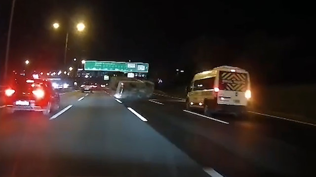 Öte yandan, kaza anı aynı yönde seyreden bir başka otomobilin araç içi kamerasınca kaydedildi. Görüntülerde, makas atarak ilerleyen hafif ticari aracın çarptığı kamyonetin devrildiği anlar yer alıyor.