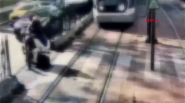 Beyoğlu Tophane durağında yolun karşısına geçmeye çalışan motosiklete tramvay çarptı. Kaza nedeniyle yola savrulan 2 kişi ambulansla hastaneye kaldırıldı. Tramvayın motosiklete çarpma anı ise güvenlik kamerasına yansıdı.
