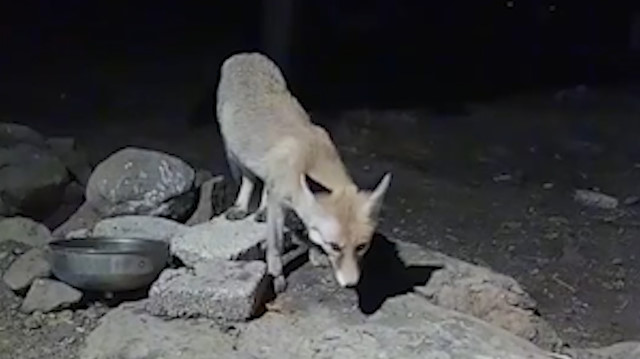 Bingöl'ün Solhan ilçesinde bulunan güneş enerjisi santralinde çalışan güvenlik görevlileri, elleriyle beslediği tilkiyle dost oldu.