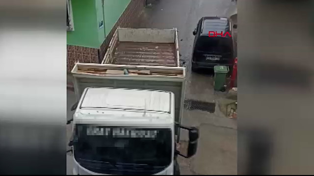 Bursa'da, park halindeki hafif ticari araç nedeniyle ara sokağa dönemediği öne sürülen kamyon şoförü, manevra yaptı. Kamyonun kasasıyla araca zarar veren sürücü, uzaklaştı. O anlar, bir kişinin cep telefonu kamerasıyla kaydedildi.