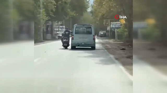 Edinilen bilgiye göre, Osmangazi ilçesinde trafikte seyir halinde olan motosiklet sürücüsü, yolda karşılaştığı ticari aracın sürücüsü olan arkadaşıyla sohbet etmek istedi. Sohbete dalan sürücü, bir kolunu aracaya yaslayıp diğer eliyle motosikleti sürmeye devam etti. Trafiği ve kendi canını hiçe sayan sürücülerin bu tehlikeli yolculuğu, cep telefonu kamerasıyla anbean kaydedildi.