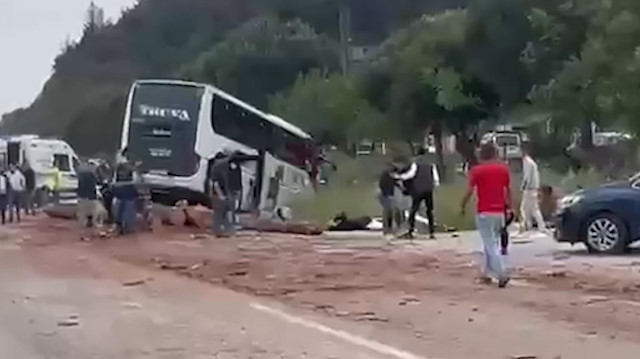 Çanakkale'de Truva Seyahate ait yolcu otobüsü ile tomruk yüklü kamyon ve bir de otomobilin karıştığı kazada ilk belirlemelere göre 6 kişi hayatını kaybetti. Çok sayıda kişi yaralandı. Kaza saat 13.00 sıralarında Çanakkale-Ezine Karayolundaki bir benzin istasyonu yakınlarında meydana geldi. Truva Seyahate ait yolcu otobüsü tomruk yüklü kamyon ve otomobilin karıştığı kazada ilk belirlemelere göre 6 kişi hayatını kaybetti. Çok sayıda yaralının olduğu öğrenildi. Olay yerine jandarma, polis ve sağlık ekipleri sevk edildi. Yaralılar sağlık ekiplerinin olay yerindeki ilk müdahalelerinin ardından hastanelere sevk edildi. Kaza ile ilgili inceleme başlatıldı. Yola savrulan tomruklar ise Ezine Belediyesi ekipleri tarafından yoldan kaldırılıyor.